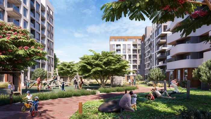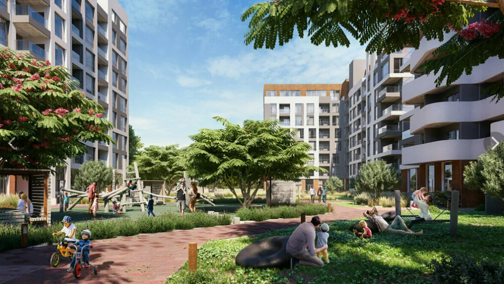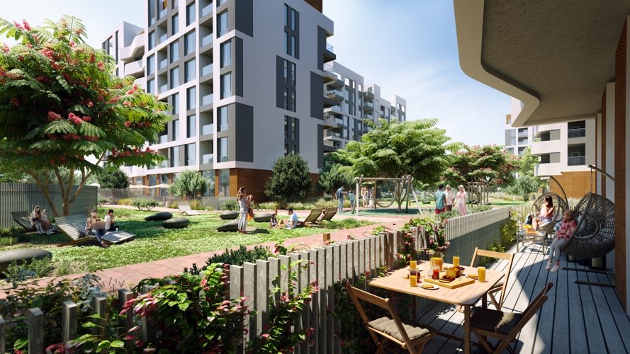 Дворы утопают в зелени, дизайнерские зоны отдыха, розовые закаты — ощущение гармонии с природой.