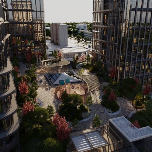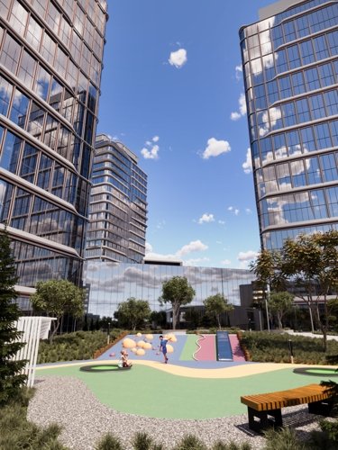 Внутреннее пространство комплекса включает в себя зеленые зоны, детские и спортивные площадки, а также зоны для отдыха
